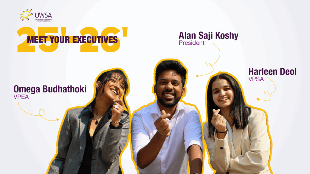 Before stepping into this role, I was actively involved with campus groups like the Indian Students’ Association and worked as a Sustainability Ambassador with the UWinnipeg Sustainability Office. I also held a part-time position as an office administrator and previously served as the UWSA Community Liaison Director, where I gained valuable insight into student advocacy.